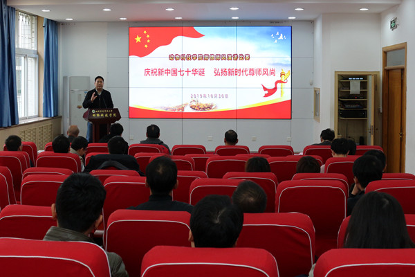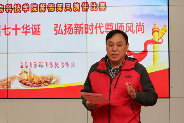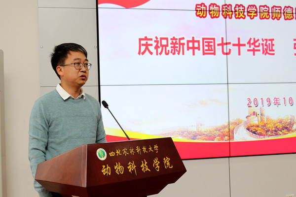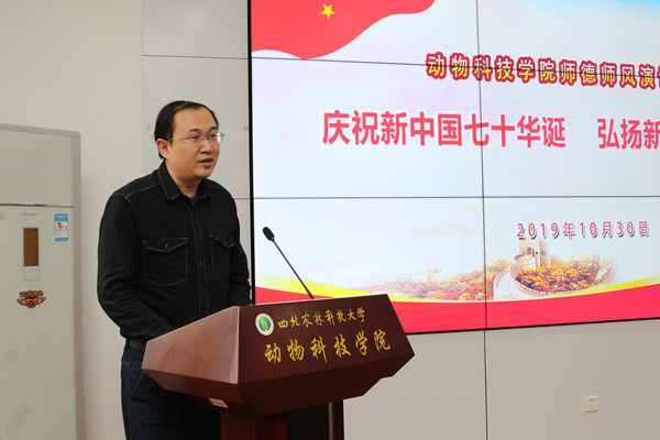 为庆祝新中国成立七十周年,深入贯彻落实全国教育大会精神,10月30日下午,国产在线 在107会议室举行主题为“庆祝新中国七十华诞,弘扬新时代尊师风尚”的师德师风演讲比赛,国产在线 党委书记曹军会、院长姚军虎、45岁以下青年教师到场观摩了比赛。本次比赛活动由教学副院长孙超主持,动医国产在线 童德文教授、动物营养与环境卫生系杨小军教授、生命国产在线 史玮副教授受邀担任评委。
