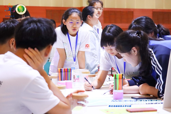 在设计与实践环节,一百名营员按照预先划分好的10个小组,将讲座中的知识与自己的想象充分结合,共同在画板上完成水生态系统的设计,并相互交流,营员们以多彩的颜色与丰富的内容展示自己的理解,并进行展示评比。