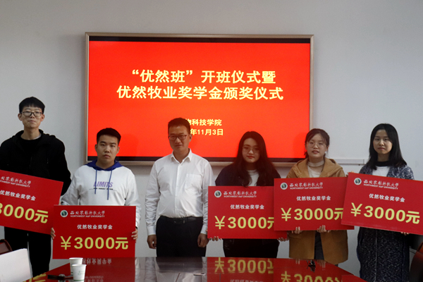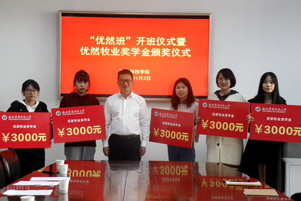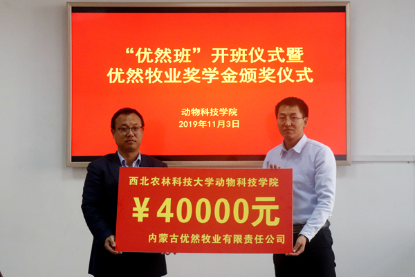“优然牧业奖学金”由优然牧业有限公司出资设立,用于奖励动科国产在线 优秀学生,根据公司与国产在线 校企合作协议,双方共同评选出优然牧业奖学金获得者李佳青等十名同学,每人奖励3000元。王力副书记对获奖同学表示祝贺,鼓励优然牧业班的同学们在专业发展上,在学习成长中常怀感恩之心,以优异的成绩反馈企业、汇报母校、回报社会,努力成长为新时代科技人才。
