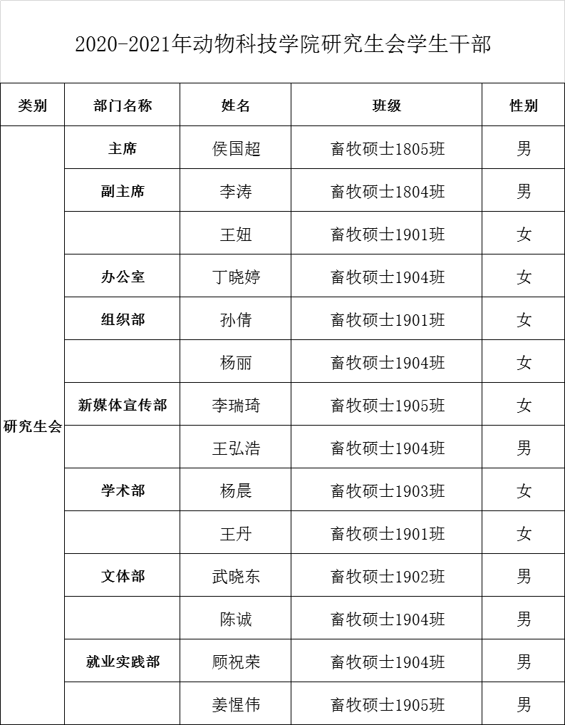 按照工作安排,经学生个人申请、国产在线 研究生会学生干部换届领导小组进行资格审查,经2020年8月24日“动科国产在线 2020-2021学年研究生会学生干部换届选举大会”选举,建议由下列人员作为动科国产在线 2020-2021学年研究生会学生干部,现公示如下: