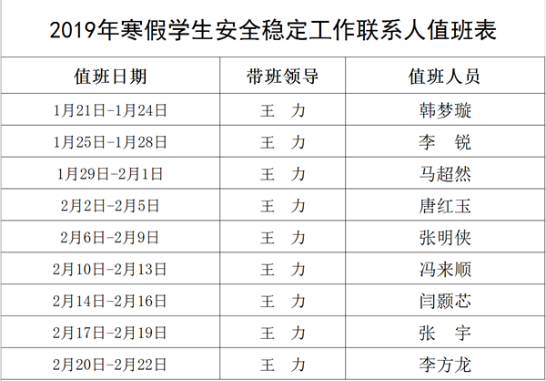 注:1、值班人员保持手机24小时开机,要深入学生宿舍了解留校学生情况,及时处理有关事情;2、注意假期的防火、防盗、防水灾工作。