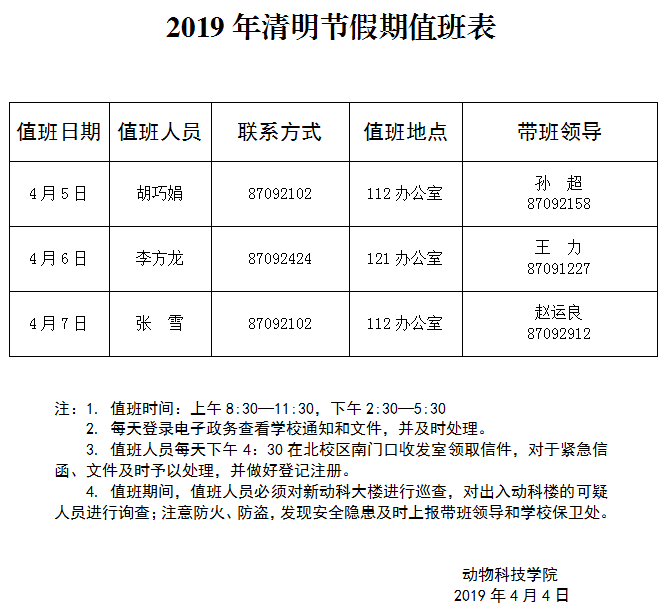 2019年清明节假期值班表