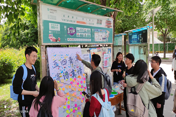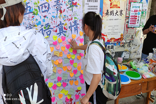 活动现场中央立着一个展板,上面贴满着由各位同学们写下美好祝福的便签。这其中有像:“今天是五四青年节,祝你微笑露一点,烦恼少一点,活力多一点,忧愁少一点,朝气满一点,脾气小一点,事情多做点,偷懒少一点,生活快乐多一点!”的语句,洋溢着对今天美好生活的珍惜之情。更有像:“青年年轻有魄力,青年奔放有朝气,青年活泼有活力,青年开放有魅力,青年节,祝你青春的日子活力,年轻的日子豪迈,一生的日子美丽。”优美的语言充满着同学们对未来的美好愿望。