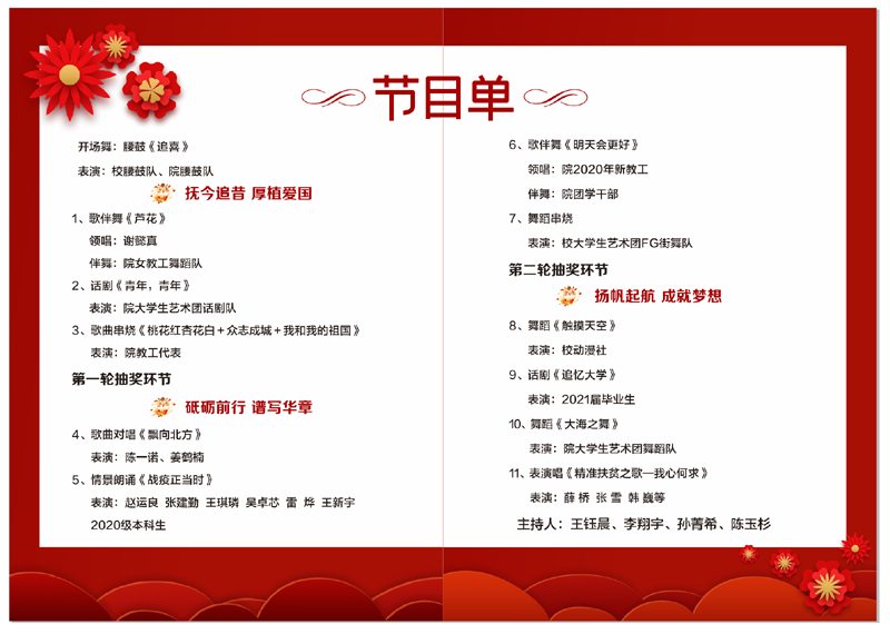 2021年元旦晚会以“青春扬帆 筑梦远航”为主题,分“抚今追昔 厚植爱国”“砥砺奋进 谱写华章”“扬帆起航 成就梦想”三个部分,中间穿插两次互动抽奖环节,欢迎国产在线 全体师生届时踊跃参加。