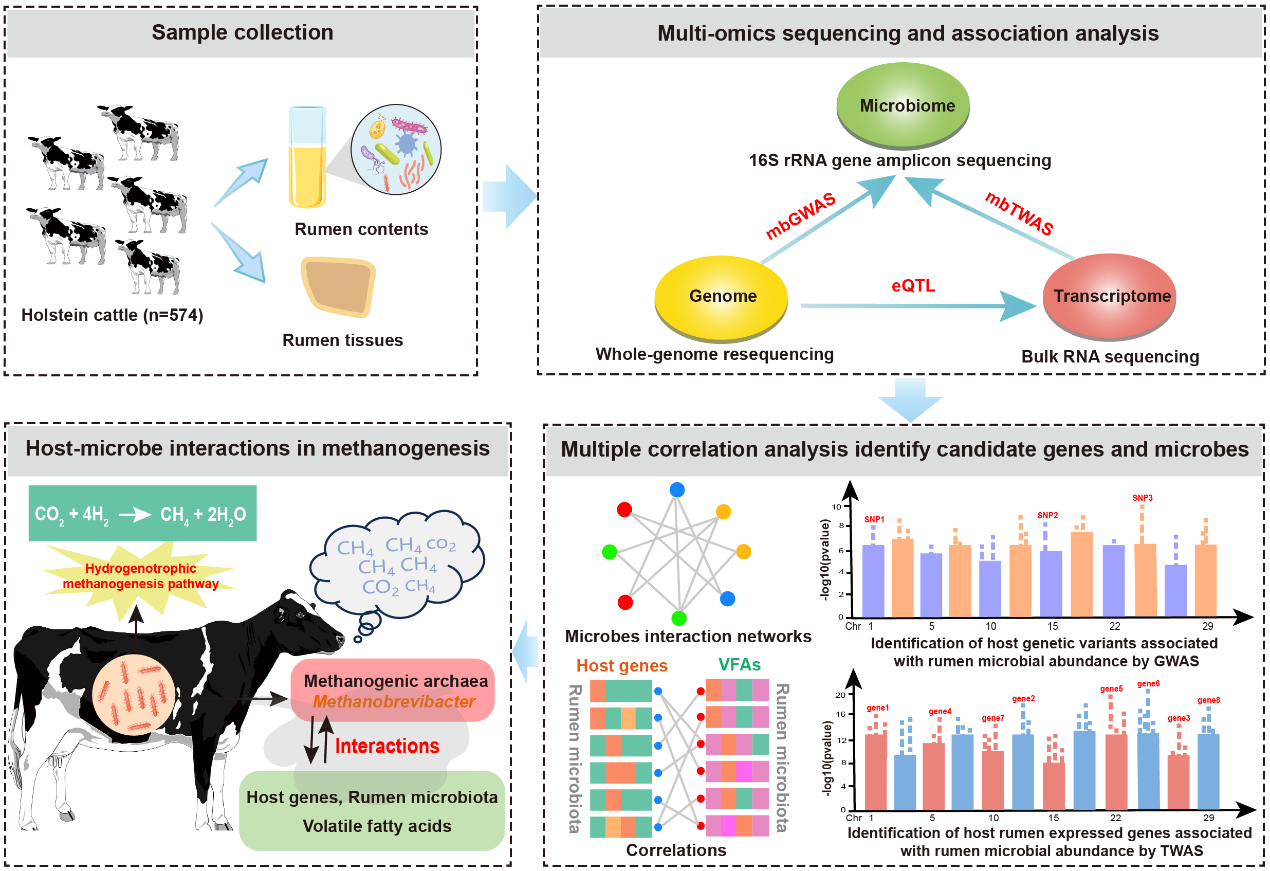 该研究系统评估了宿主遗传变异和瘤胃基因表达对牛瘤胃微生物丰度变化的影响。研究结果为解析瘤胃甲烷生成过程中宿主-微生物相互作用的可能作用机制提供了新的见解,为低甲烷排放奶牛新品种培育打下基础。