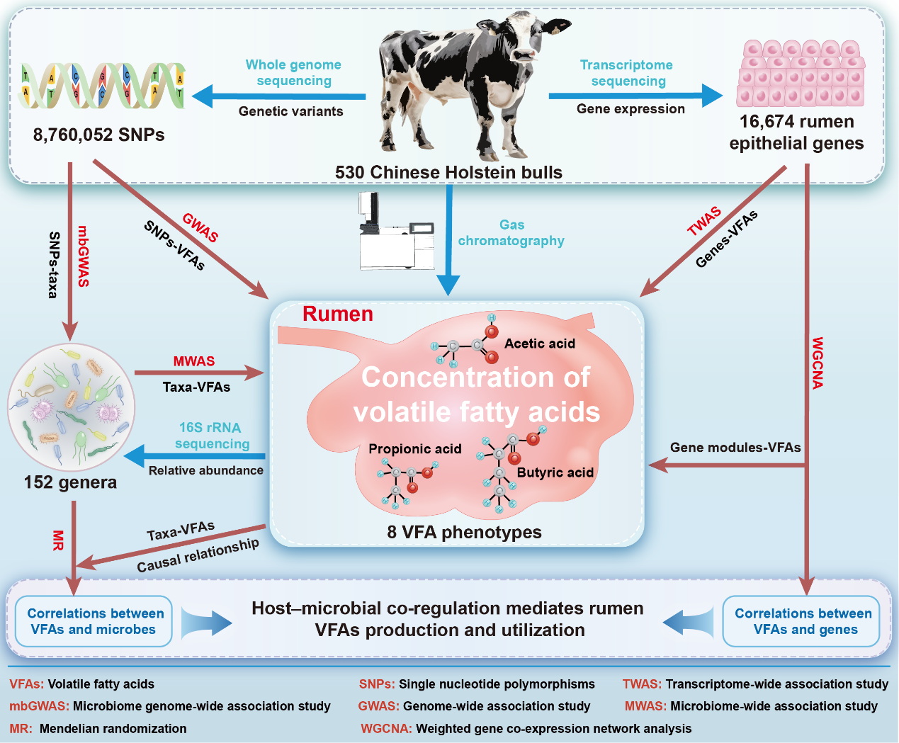 牛、羊等反刍动物的瘤胃微生物发酵产生的挥发性脂肪酸(VFAs)可为宿主提供70%以上的能量来源。挥发性脂肪酸主要包括乙酸、丙酸、丁酸、戊酸、异丁酸和异戊酸等。前期研究发现乙酸、丙酸等VFAs的生成直接影响奶牛的泌乳性能。因此,解析宿主-微生物在VFAs产生和利用中的调控作用,对提升反刍动物生产性能和优化饲料能量利用效率具有重要意义。然而,瘤胃微生物区系如何影响VFAs生成,哪些关键微生物能够因果性的调控瘤胃VFAs浓度尚不清楚。此外,宿主瘤胃上皮基因如何响应不同浓度VFAs的吸收、转运和代谢过程,进而平衡能量高效利用,长期以来缺乏系统的解答。