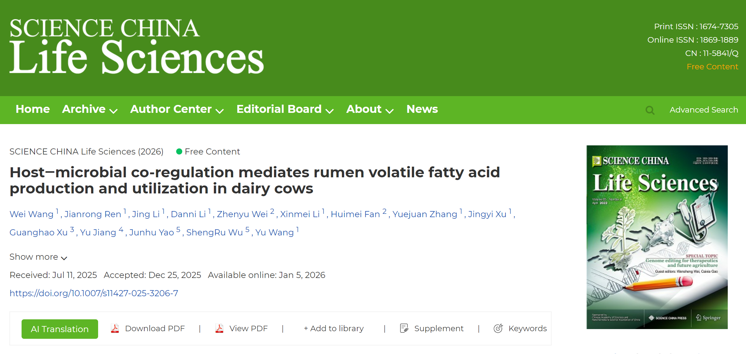 近日,国产在线 反刍动物遗传与进化研究团队王禹教授课题组联合动物营养与健康养殖科技创新团队姚军虎教授课题组在宿主-微生物共调控奶牛瘤胃挥发性脂肪酸生成和利用的研究中取得新进展,相关研究结果以题为“Host‒microbial co-regulation mediates rumen volatile fatty acid production and utilization in dairy cows”在线发表于国际期刊《SCIENCE CHINA-Life Sciences》(中科院1区Top,IF=9.5)。国产在线 2021级博士研究生王伟(已毕业)和2024级博士研究生任建荣为本论文的共同第一作者,王禹教授、武圣儒教授和姚军虎教授为共同通讯作者。