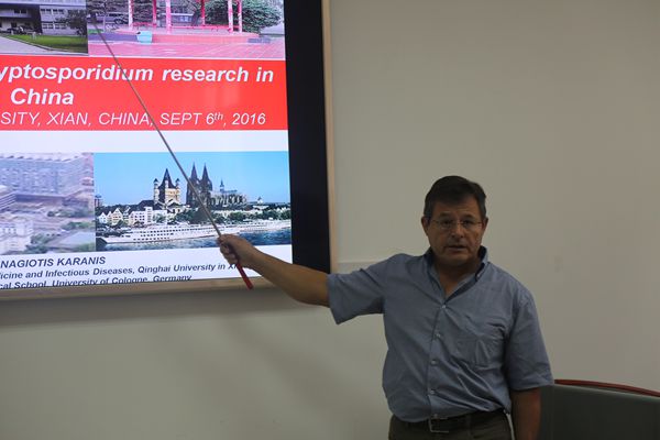 报告会上,Panagiotis Karanis教授介绍了自己的研究经历以及团队目前的研究进展,重点讲述了隐孢子虫的发现概况,传染给人类的传播途径以及发病机制。在隐孢子虫导致的腹泻等疾病预防和治疗方面,Panagiotis Karanis教授团队研究成功了监测水中隐孢子虫以及隐孢子虫疫情分析的方法。最后,Panagiotis Karanis教授介绍了隐孢子虫病在世界范围内的大面积爆发,隐孢子虫的生长发育及所需环境,隐孢子虫的实验培养方法等内容。