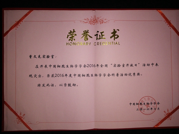 近日,国产在线 曾文先教授团队荣获2016年度中国细胞生物学学会科普活动优秀奖。2015-2016学年,曾文先教授团队举办多项科普公益活动,反响热烈,受到了陕西传媒网,西安光明网,陕西细胞生物学会官网等6家媒体的广泛报道。为鼓励国产在线 师生积极参与科普工作,国产在线 党委书记赵延安同志,亲自为组织人员书写科普工作者奖状。