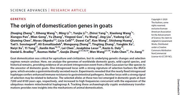 5月20日,Science旗下著名期刊ScienceAdvances《科学进展》以封面论文报道了我校动科国产在线 姜雨教授团队有关“山羊驯化基因的起源””的文章,阐明了现代山羊广谱适应能力强源于通过杂交获得其他物种的MUC6基因, 该基因与其他驯化基因一起,帮助山羊成为最早被成功驯化并广泛传播的家畜。同日,《科学》杂志正刊以“Ancient hanky panky gave modern goats their iron stomachs”为题,对该发现进行了采访和报道。