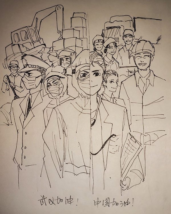 水产1901班赵美琪克服疫情期间难以购买颜料的困难,利用绘图软件进行电子绘画,“岂曰无衣?与子同袍”疫情面前,武汉并不孤独,冲锋在前线的战士们并不孤独,我们每个人都是同袍。动科1802班韩雨晴手绘漫画平凡而伟大,奋战在前线的医护人员、志愿者、警察、建筑工人......他们是父母的孩子,是孩子的父母,他们在平凡中创造着伟大。动科1803班米金秋、动科1901班李林曦、水产1901班刘珂欣分别利用板绘、蜡笔画等致敬白衣天使,为参加武汉战“疫”的医护人员加油鼓劲,为武汉加油,为中国加油!