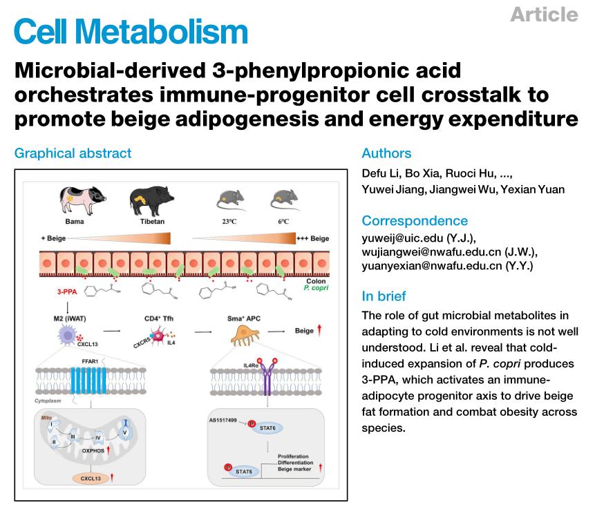 近日,国产在线 肌肉生物学与生猪遗传改良创新团队袁业现教授课题组在国际知名期刊《Cell Metabolism》在线发表题为“Microbial-derived 3-phenylpropionic acid orchestrates immune–progenitor cell crosstalk to promote beige adipogenesis and energy expenditure”的研究论文。国产在线 袁业现教授、吴江维教授和美国伊利诺伊大学芝加哥分校Yuwei Jiang教授为共同通讯作者。动科国产在线 在读博士生李德富、青年教授夏博、伊利诺伊大学芝加哥分校Ruoci Hu为共同第一作者。