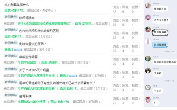 课程通过团队老师们努力,收到了良好的效果。每个课程视频每个学生平均观看率3.03次、章节作业和测试平均完成率达到96.5%、发帖提问147次、答疑回复941次、学生讨论参与度达98.7%、在线课程出勤率99.1%、慕课成绩平均87.46分。从课后作业、答疑、讨论及测试等情况看,全过程考核很好地保证了在线教学效果,达到了教学大纲和课程质量标准的要求,学生参与程度还要高于传统线下教学,在疫情影响的情况下,《牛生产学》授课团队齐心协力,克服困难,保证了教学质量。